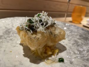 貝柱に葦北ちりめんをあしらったアナゴのフリット♪