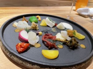 菊芋やカブなど干し野菜と魚をあしらい
