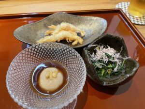 里芋クリーム・春菊と子持ち昆布のお浸し・白エビ白扇揚げ♪